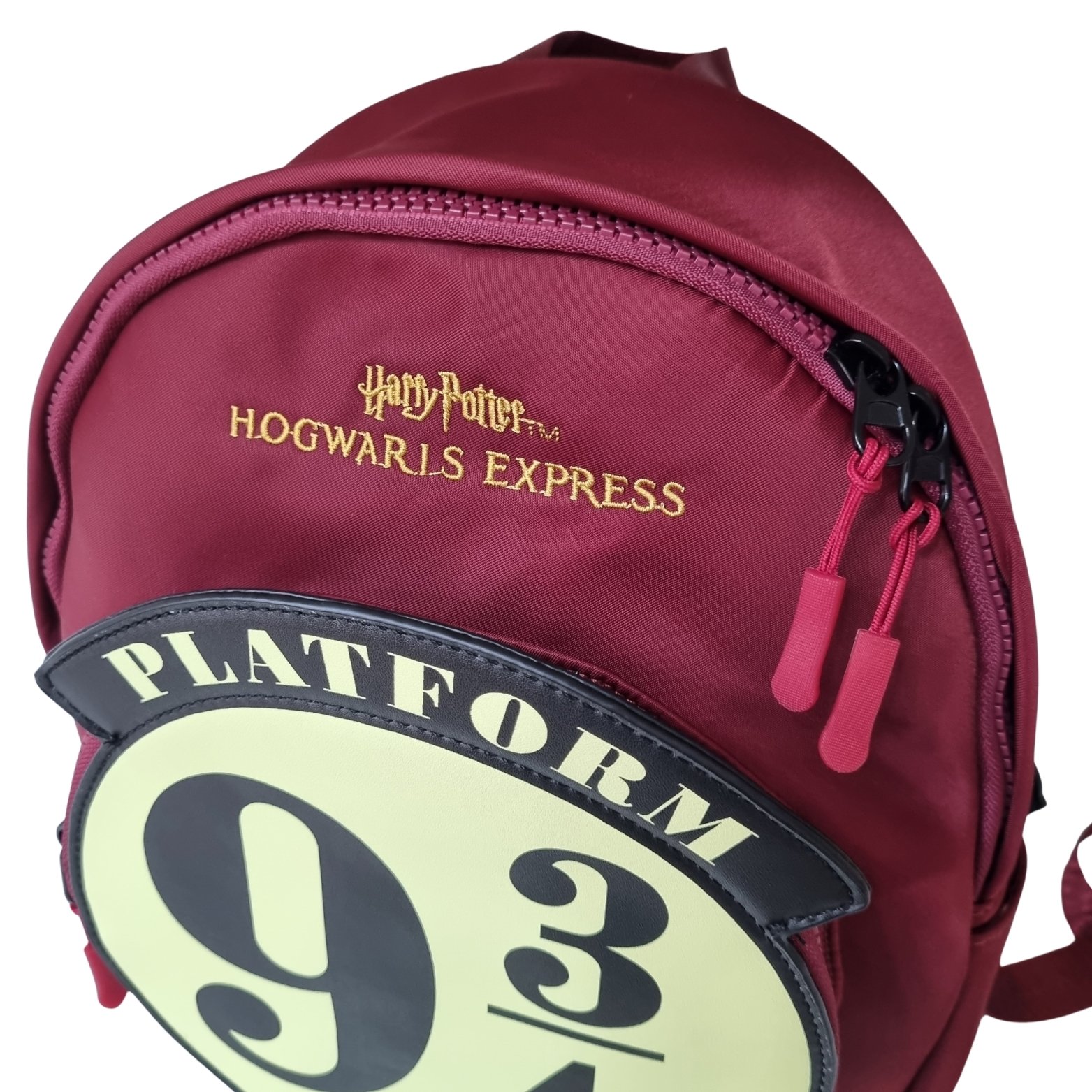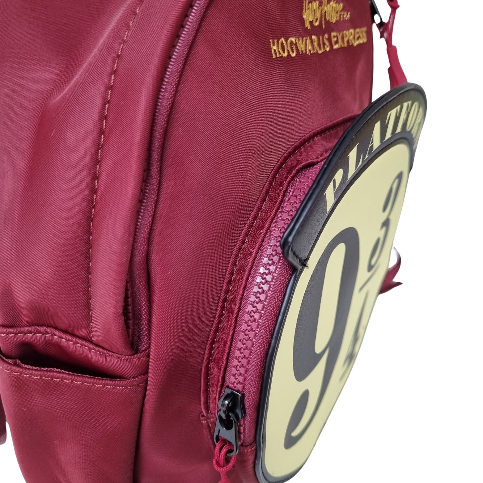 Mochila plataforma 9 3/4 de Harry Potter. Sus medidas aproximadas son 30 cm de alto, 23 cm de longitud y 9 cm de ancho.
